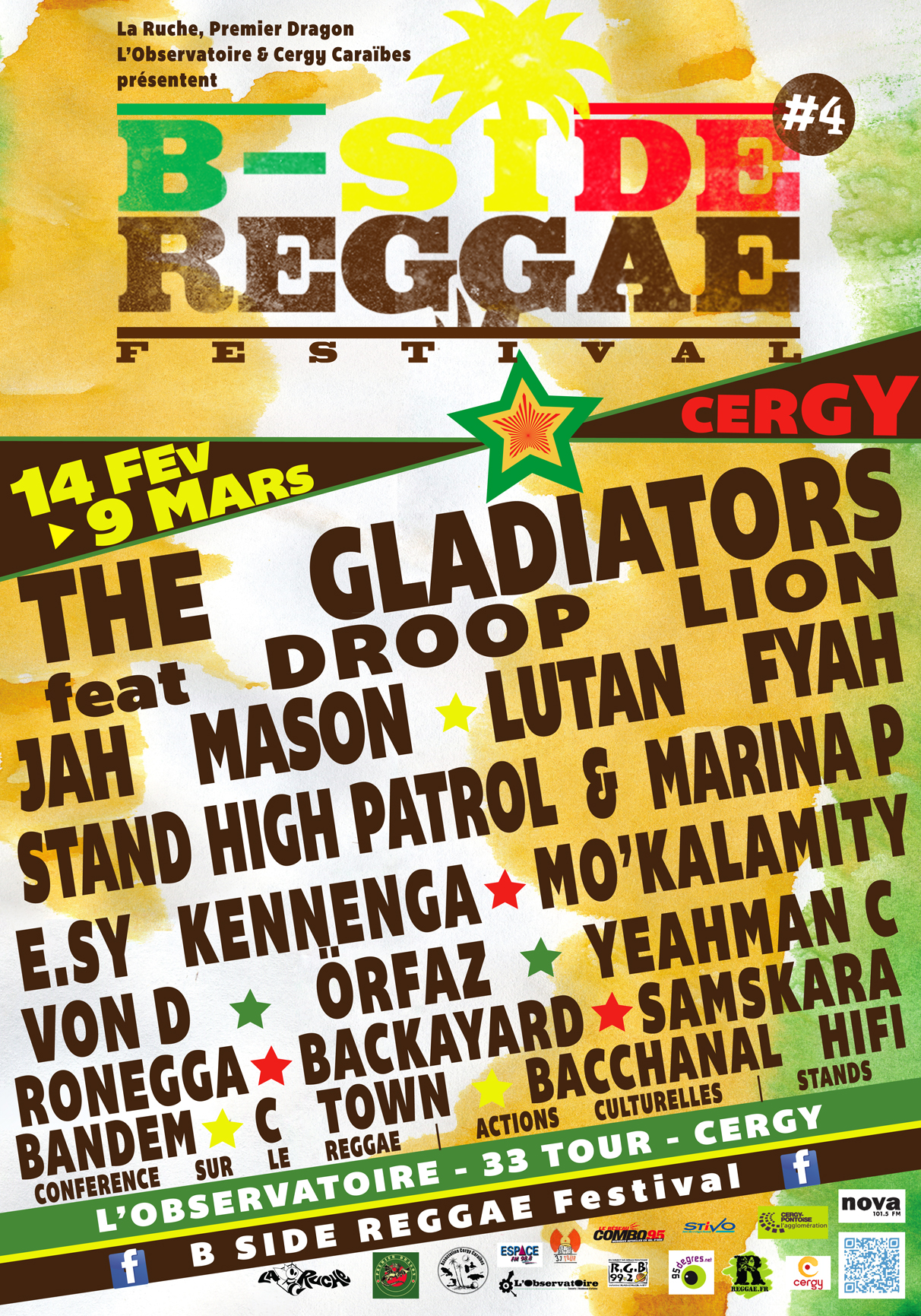 Entre février et mars, le Festival B’Side Reggae #4, c’est 5 dates de concerts dédiés au reggae roots, dub digital, dub electro, jungle et ragga largement représentés par des artistes de renommée nationale et internationale. The Gladiators feat Droop Lion, Stand High Patrol (Rootystep et Macgyver) feat Marina P., Von D, Jah Mason, Lutan Fuyah et encore bien d’autres… vont remplir vos agendas de ces mois de février et mars à Cergy (95)…