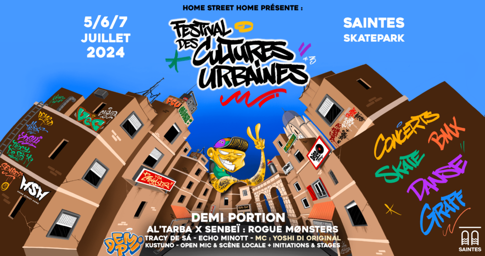 Festival des Cultures Urbaines #3 qui aura lieu au Skatepark de Saintes du 5 au 7 juillet 2024. C’est un événement familial, socio-culturel et pluridisciplinaire.