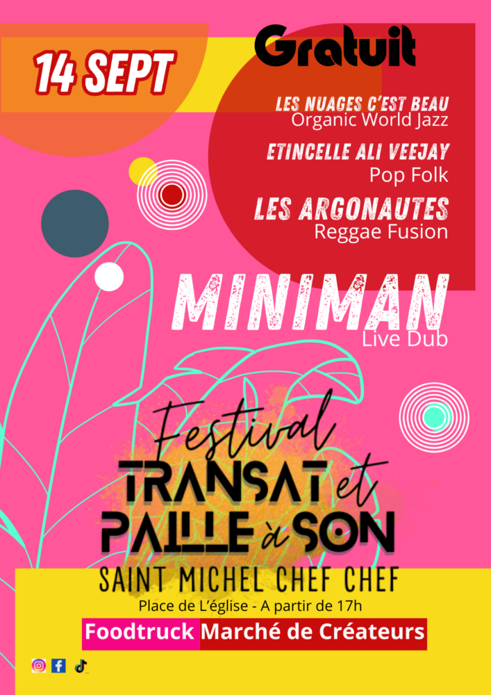 Village d’Artisans-Créateurs, la Sweet Cantine et le Bar accueillant de l’Asso + 2 food-trucks, et une belle programmation. Le duo World Jazz « Les Nuages c’est beau », la performance choralo-active d' »Etincelle », le Reggae Fusion des « Argonautes », et le Live très attendu d’une légende française du Dub : « Miniman »