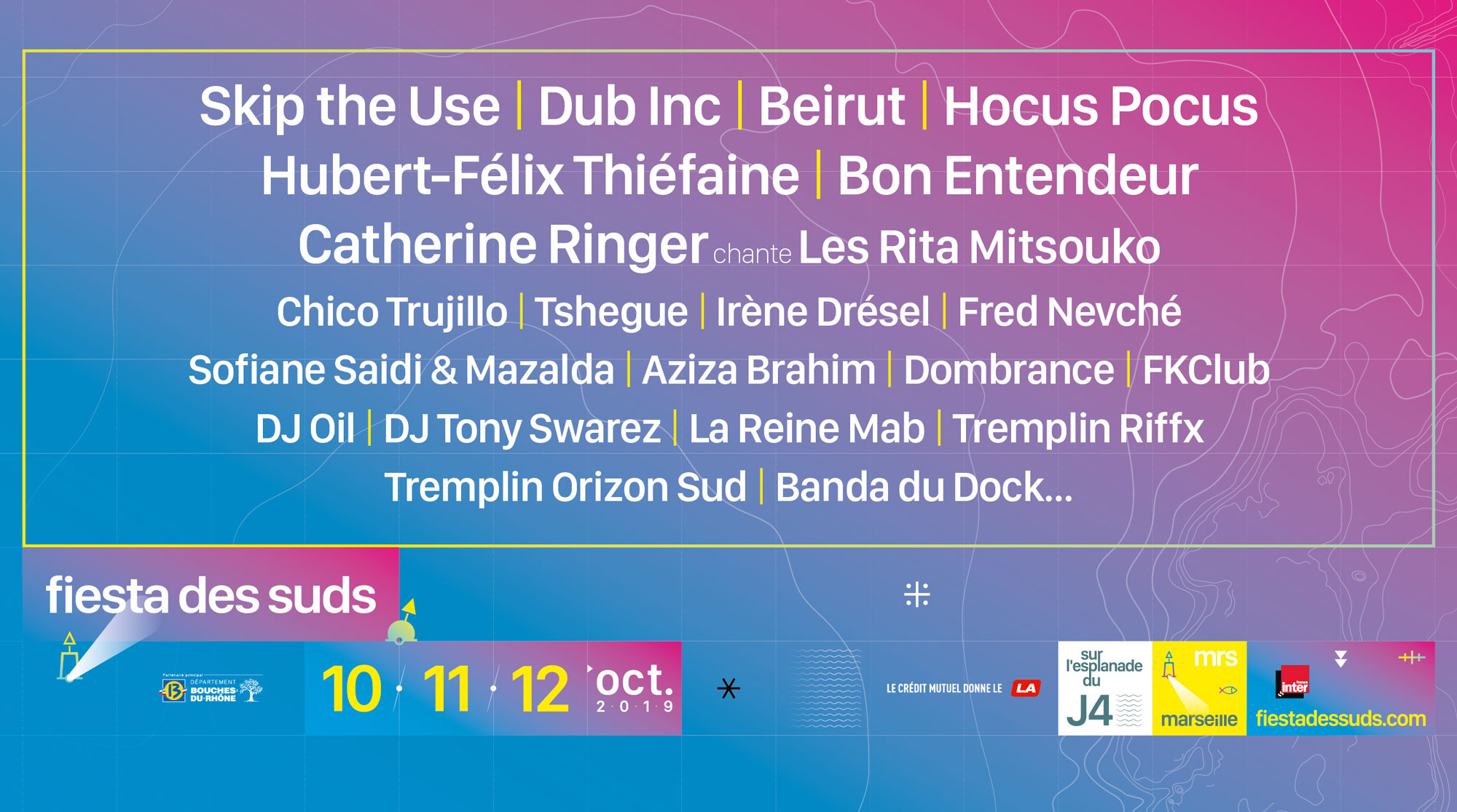 Le Festival Fiesta Des Suds 2019 vous donne rendez-vous pour une nouvelle édition à Marseille du jeudi 10 octobre 2019 au samedi 12 octobre 2019. Au programme du Festival Fiesta Des Suds 2019, retrouvez Dub Inc pour une date immanquable! Mais aussi Catherine Ringer, Hubert Félix Thiéfaine, Skip The Use, Hocus Pocus, Beirut, Bon Entendeur, Chico Trujillo, Fred Nevché en concert à Marseille.