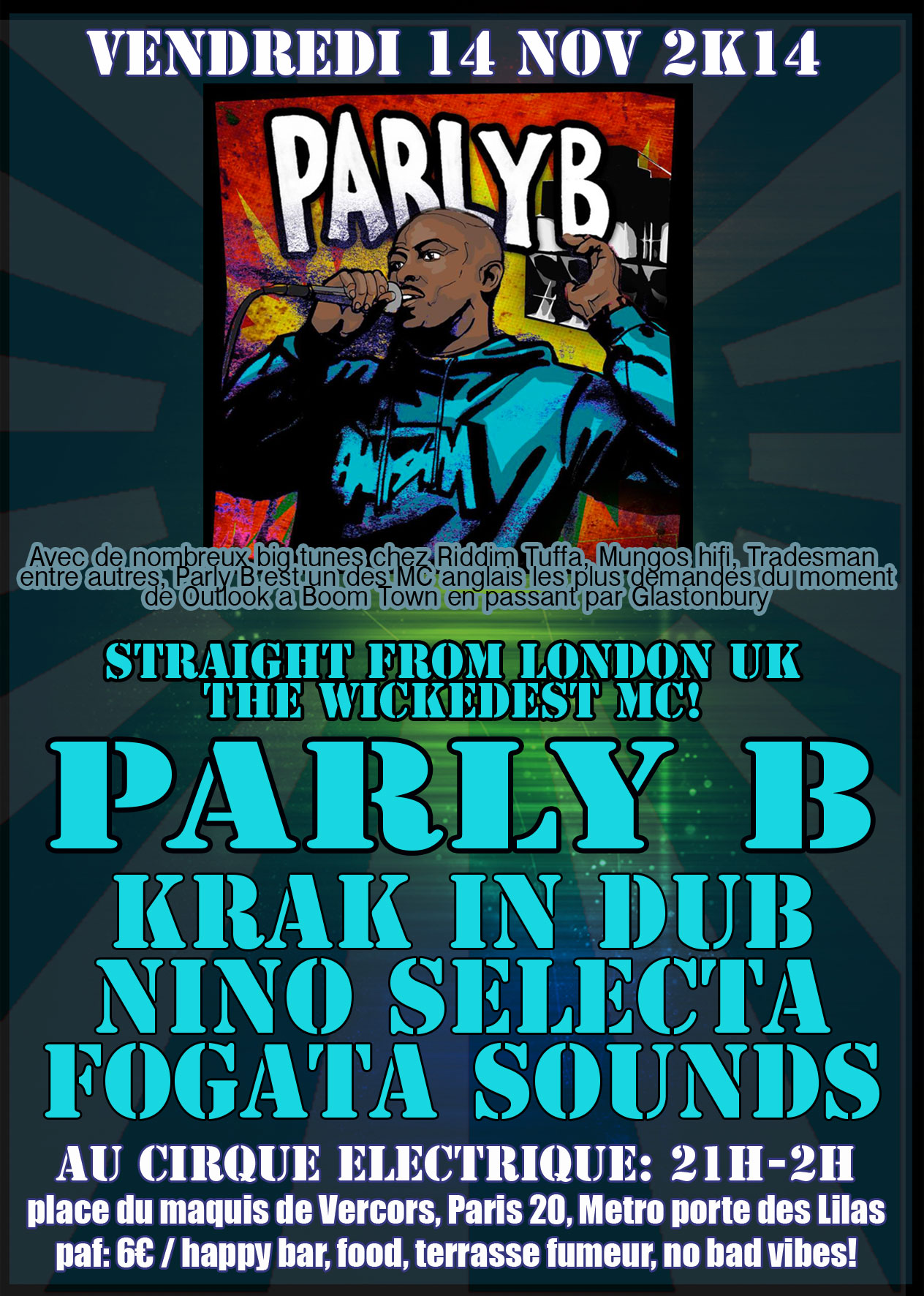 Notre invités Parly B sera backé par les DJ Krak in Dub et Nino Selecta, Fogata Sounds vous fera dancer jusqu’à la fermeture en mode RUBADUBSTEP et JUNGLE.