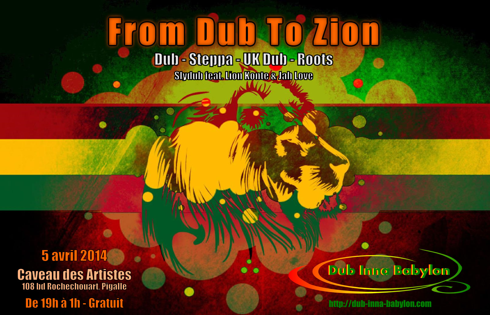 Massive dub session le 5 avril au Caveau des Artistes! Dub Inna Babylon investit les lieux avec au programme une bonne dose de dub, roots, steppa, UK dub, digital, dubstep pour tous les connaisseurs de basse et amateurs de riddims soignés…