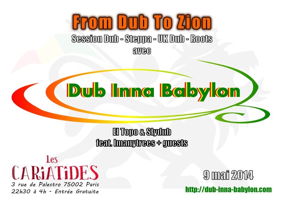 Dub Invasion! Dub Inna Babylon investit Les Cariatides le 9 mai. Tu es un inconditionnel des riddims? Tu veux te sentir irie? Tu aimes les positive vibes? Alors viens skanker à la dub session From Dub To Zion, avec au programme une bonne dose de dub, roots, steppa, UK dub, digital, et dubstep, pour tous les accrocs des basses… Toutes les vibes dubwise seront représentées.