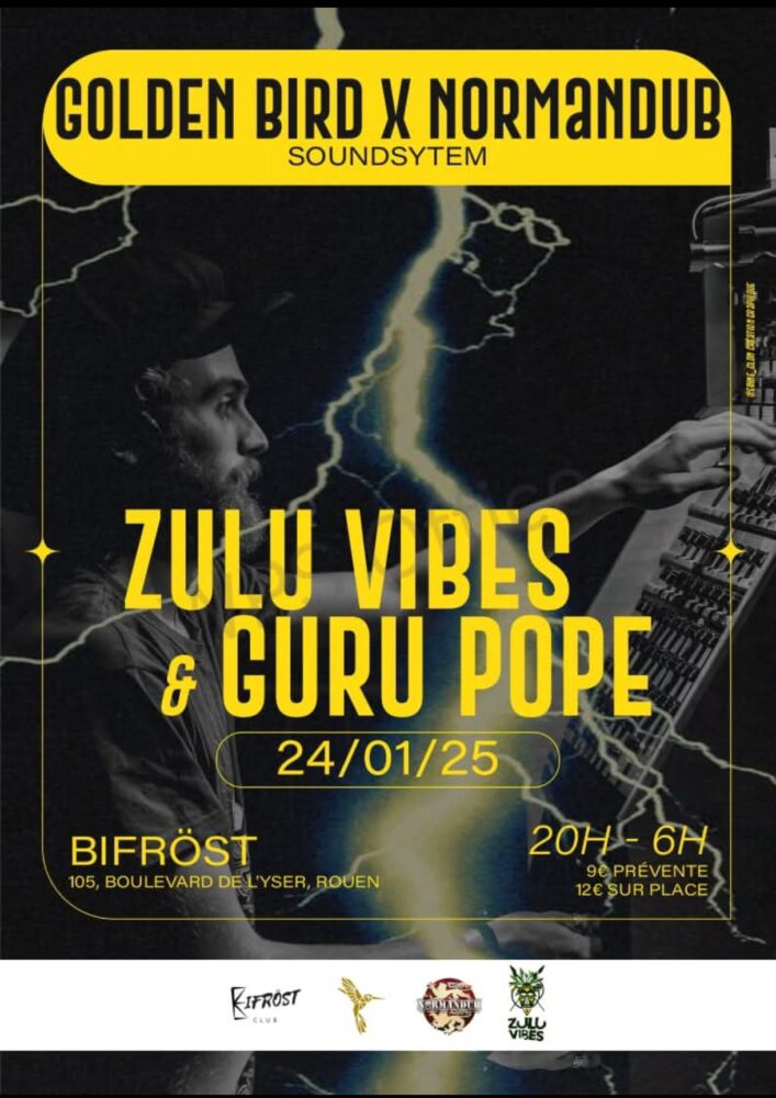 Les sound systems Golden Bird et Normandub unissent leurs forces une nouvelle fois, pour vous offrir une session inoubliable, en invitant Zulu Vibes à prendre les commandes le temps d’un set Il sera accompagné de Guru Pope, dont les impros au saxophone, viendront sublimer cette expérience musicale pour votre plus grand plaisir!