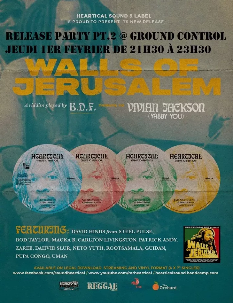 Le jeudi 1er février, nous serons au GROUND CONTROL pour fêter la sortie de notre nouveau projet one-riddim « Heartical & BDF present : Walls Of Jerusalem », rdv de 21H30 à 23H30, entrée gratuite !
