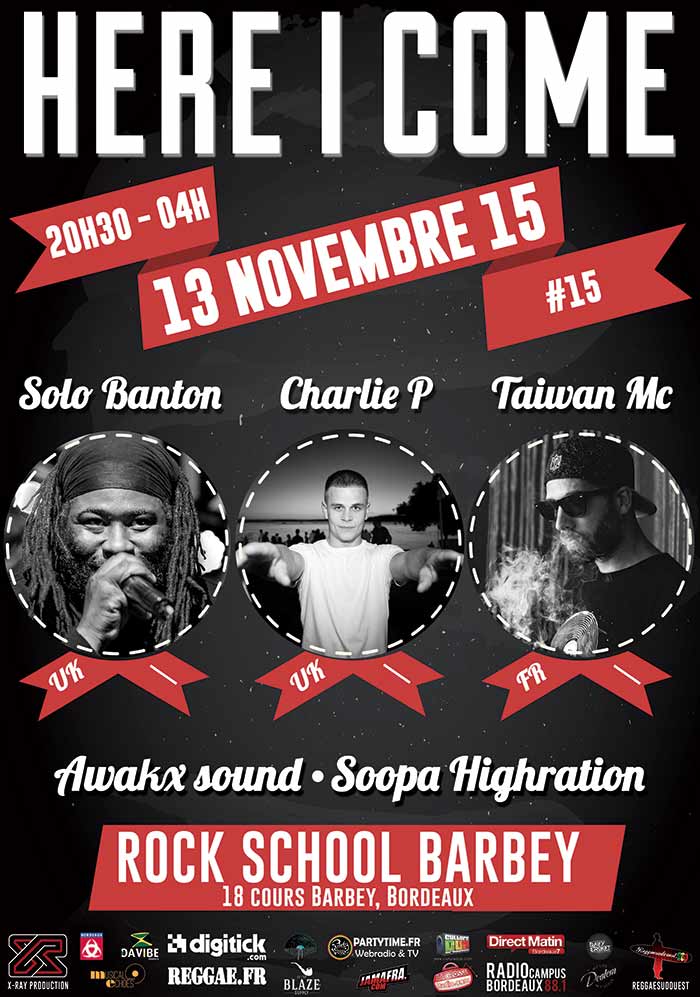 Lancées en 2007, les soirées Here I Come parcourent les scènes partout en France. En résidence à la Rock School Barbey depuis 2013, les soirées sont à dominante reggae, dub et digital, mais explorent également d’autres courants musicaux tels que le hip hop, la jungle et la drum’n’bass. De 20H30 à 04H00 les Here I Come mixent artistes confirmés et découvertes talentueuses.