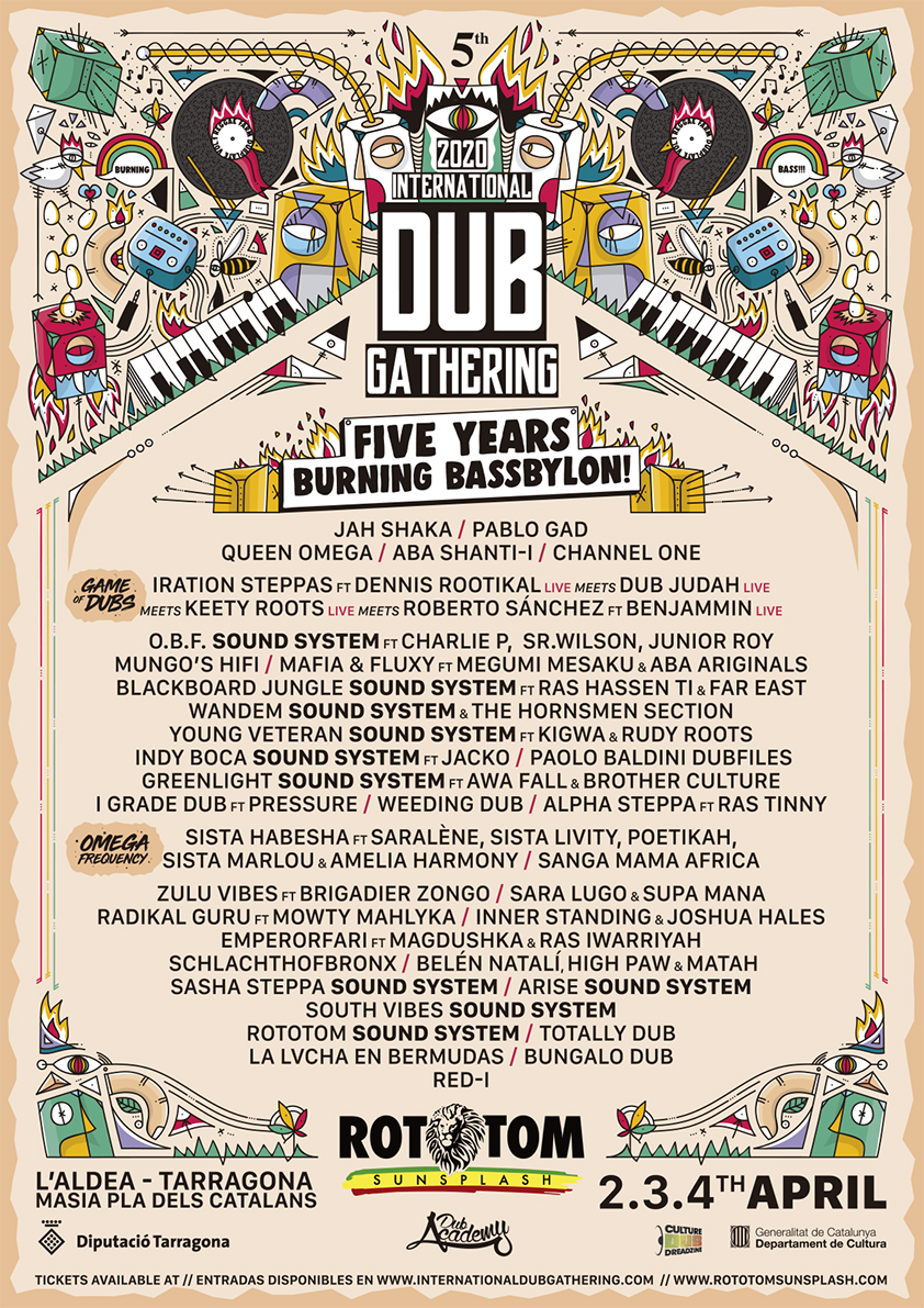 La cinquième édition de l’International Dub Gathering aura lieu les 2, 3 et 4 avril 2020 : trois jours et trois nuits pleins de concerts des meilleurs artistes du panorama international qui, en plus des activités ludiques et culturelles et d’un environnement imbattable comme celui de L’Amposta (Tarragona, Espagne), feront de cette édition de l’International Dub Gathering un rendez-vous à ne pas manquer pour tous les amateurs de rythmes jamaïcains et de musique en général.