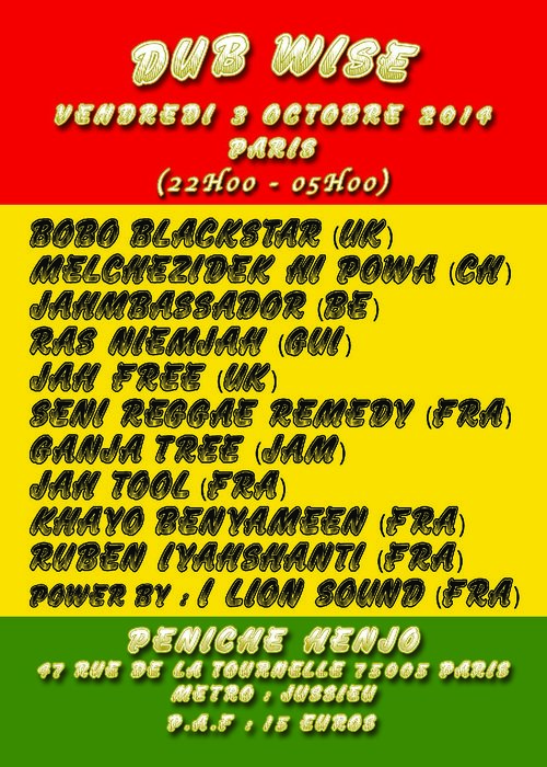 BOBO BLACKSTAR (UK) MELChezidek HI POWA (CH) JAHMBASSADOR (BE) RAS NIEMJAH (GUI) JAHFREE (UK) SENI REGGAE REMEDY (FR) GANJA TREE (JAM) JAHTOOL (FR) KAYO BENYAMEEN (FR) RUBEN IYAHSHANTI (FR) POWER BY : I LION SOUND (FR)