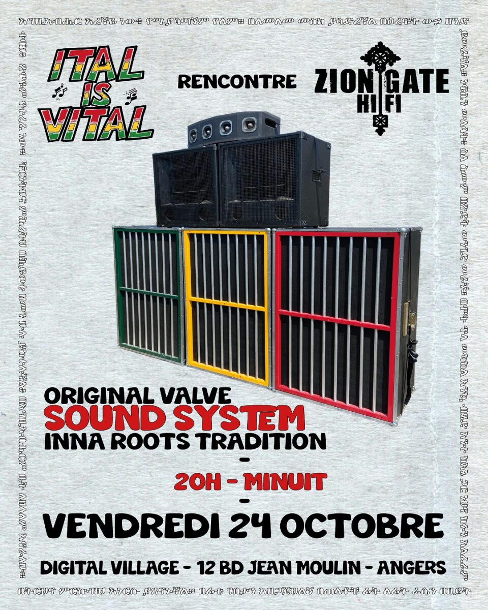 Zion Gate jouera sur la sono d’Ital Is Vital : L’original 2 voies composé de 3 caissons « Bass-Reflex » hérités du mythique « JahLoveMuzik » ainsi que de 2 enceintes Tannoy couramment utilisées dans les années 80 par de nombreux Sound Systems anglais et d’un ampli à lampes qui donne aux basses un son riche et chaud ainsi qu’une rondeur incomparable. La « Control Tower » comprend une platine vinyle Thorens TD-124 & un préampli « Toolbox » construit par Mr. Errol qui a notamment travaillé avec des sounds prestigieux comme Sir Coxsone, Quaker City, Saxon etc.