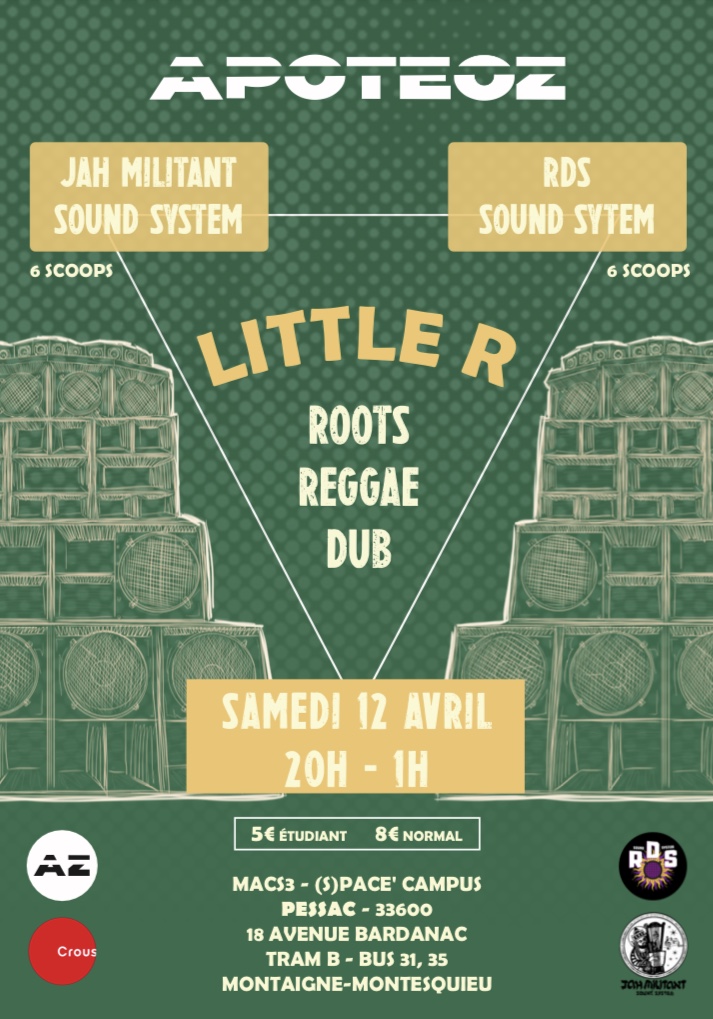 Retrouver le mighty Jah Militant, son sound system homemade de 6 scoops et son nouvel ampli à lampes en meeting avec RDS accompagné par le big & bad Little R, MC et chanteur inna rub a dub style qui nous vient tout droit de Lille.