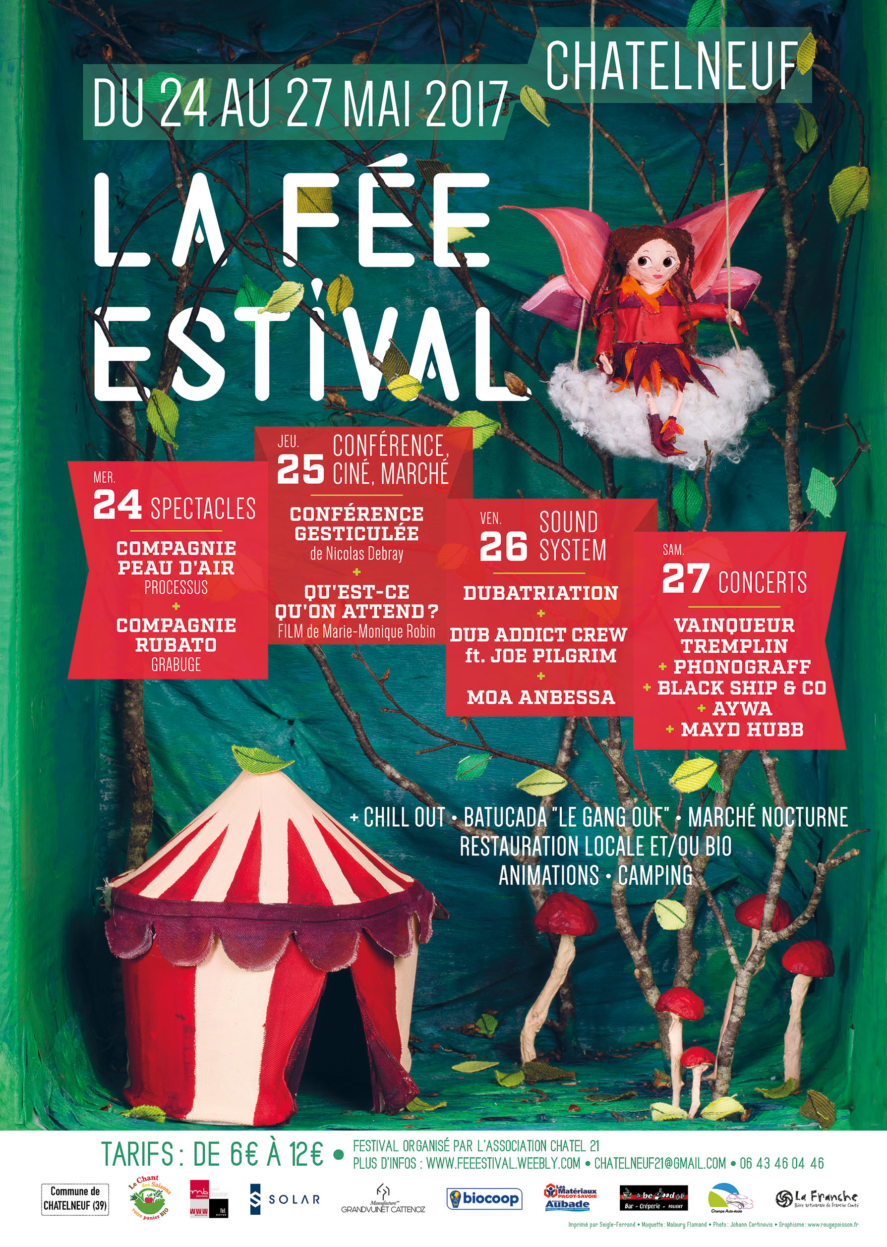 La Fée Estival c’est avant tout une rencontre d’amis et de familles qui ont décidé en 2013 de lancer leur propre festival. Dès le départ, la fine équipe réunit dans l’association Chatel21 a voulu proposer un événement culturel qui dynamise le canton et qui grâce à ces valeurs, soit bénéfique pour celui-ci. D’édition en édition, La Fée Estival a su proposé spectacles, concerts, marché de producteurs locaux, soundsystem, dans un site chaleureux et convivial composé d’un gros chapiteau, et décoré avec des matériaux de récupération (palettes, roues de vélo, carton…), le tout formant un véritable havre de paix. En travaillant avec les producteurs locaux, bio lorsqu’il s’agit de notre bar/restauration, nous sommes soucieux de l’impact environnemental du festival. Ainsi, nous récupérons et recyclons un maximum de matériaux de construction, des invendus de supermarché, proposons des toilettes sèches, trions entièrement nos déchets, utilisons des gobelets réutilisables et faisons la chasse aux emballages à usage unique !