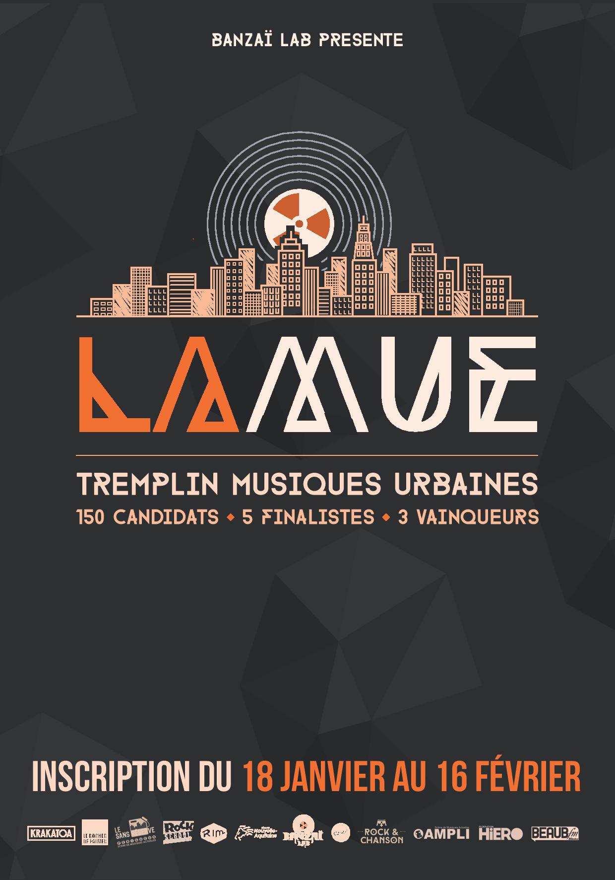 Ce tremplin a pour particularité d’être exclusivement consacré aux esthétiques de musiques urbaines : Hip-Hop, Trip Hop, Electro, Bass Music, Beatmaking, Dub, Nu Funk, Nu Soul et leurs dérivés. Réalisé en partenariat avec différentes salles de concerts de la région, LA MUE bénéficie également de l’appui du CNV et de la région Nouvelle-Aquitaine. L’année 2018 constitue la première édition de cet événement qui a pour ambition de devenir un rendez-vous récurrent dans la région.
