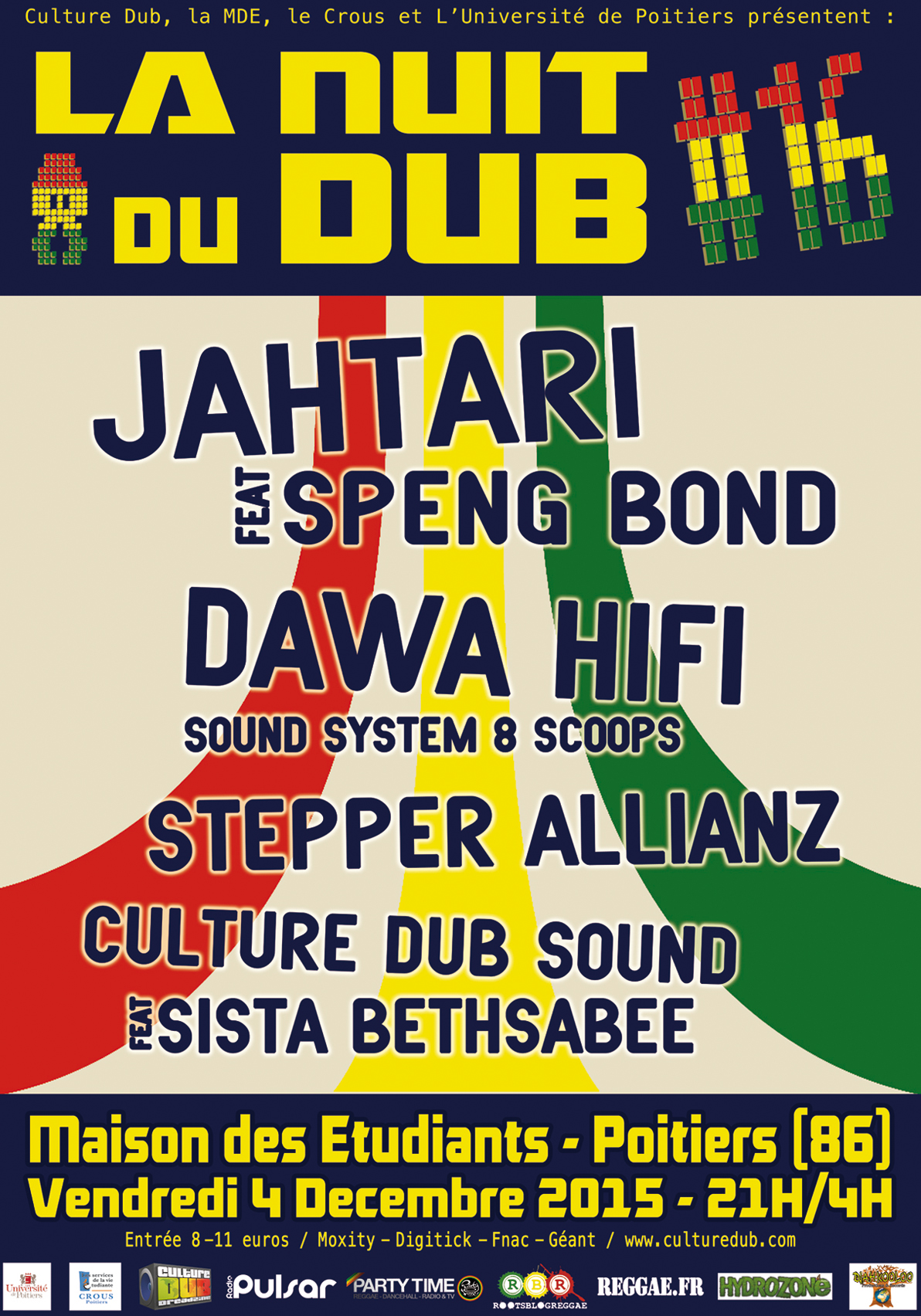 La Nuit du Dub retrouve les murs de La Maison des Étudiants à Poitiers le 04 Décembre 2015 pour une 16ème édition en compagnie de : Jahtari feat Speng Bond, Stepper Allianz, Culture Dub Sound & Sista Bethsabée, et sonorisée par les 8 scoops de Dawa Hi Fi !