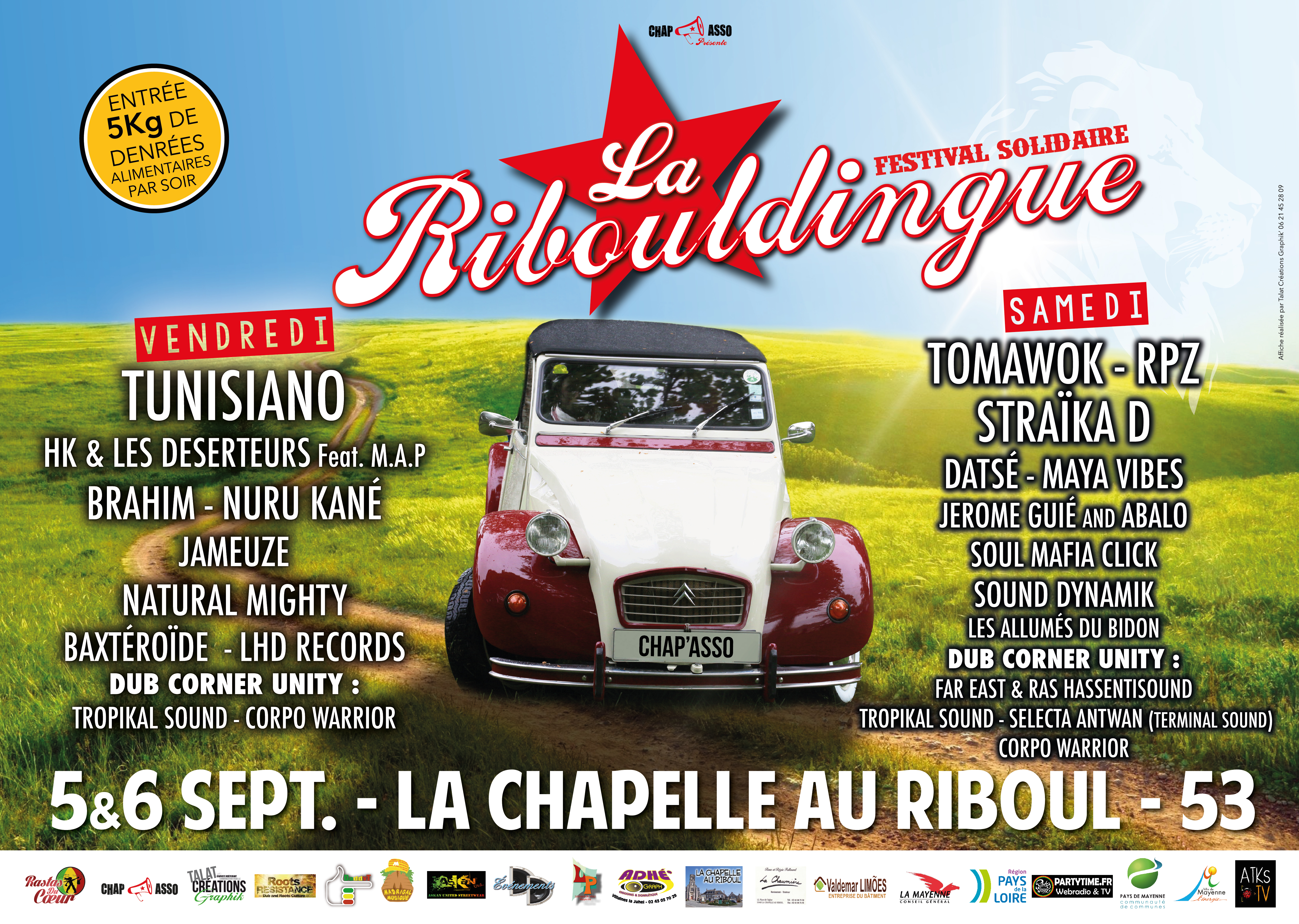 Depuis notre petit village La Chapelle Au Riboul en Mayenne (53), nous avons réussi à souffler le plaisir de s’unir en dansant dans toute la France et même au-delà des frontières. L’idée de payer l’entrée avec 5 kg de denrées alimentaires non périssables a tout de suite séduit le public intergénérationnel et les artistes qui nous suivent et nous soutiennent. Vous êtes notre meilleure subvention.