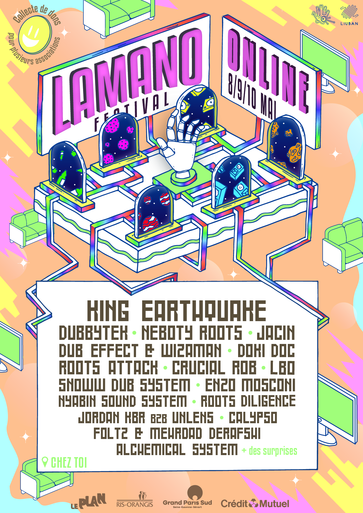 Le Lamano Online se déroulera du 8 au 10 mai 2020 pour 24h de fête sous la forme d’un live sur Facebook, de relais IGTV (Instagram) et de replay sur Youtube. La programmation regroupera une quinzaine d’artistes, dont bon nombre est déjà passé par le Lamano et souhaite participer à cet anniversaire si important à nos yeux.