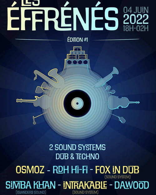 La soirée sera tournée vers la culture Dub et la Techno. Vous et vos oreilles profiterez d’une nuit 100% Sound System, où vous serez invités à nous montrer vos meilleurs pas de danse. La soirée sera animée par les superbes Collectif Osmoz, Rdh Hi-Fi, Fox In Dub Sound System, Dawood, Simba Khan et Intrakable Sound System !