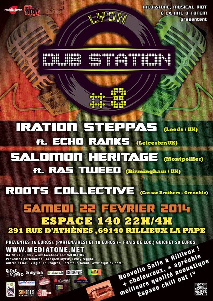 Après avoir éclot un peu partout en France et acquis le statut de soirées dub référence en Europe, les DUB STATION se sont bien installées à Lyon ! A chaque Rendez-vous, une programmation concoctée par Musical Riot autour des plus grands sound systems de la scène dub anglaise et internationale. L’originalité de ces soirées ? Les sounds se déplacent bien sûr avec leur disques, dubplates & toasters… mais surtout, à chaque édition, l’un d’eux vient avec sa propre sono de conception 100 % artisanale. Une façon unique d’apprécier le son reggae live : basses puissantes, effets psychédéliques en tous genres, expérience physique & mentale garantie ! Amateurs de reggae, dub, électro & sensations fortes, cette soirée est pour vous…