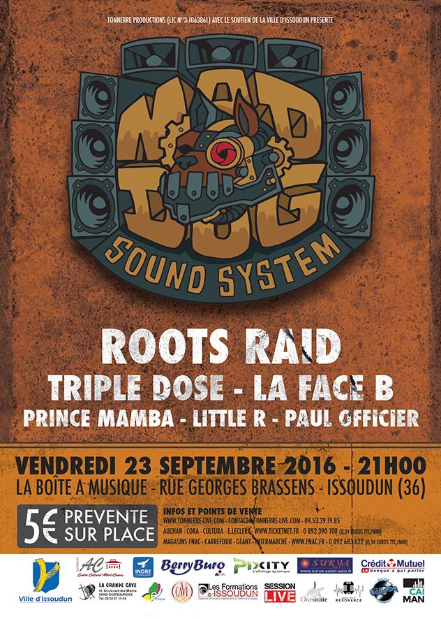 Fidèle aux sons reggae/dub Français et internationaux, la Boîte à Musique est le seul lieu Indrien à avoir accueilli autant d’infrabasses et de dub makers. Une nouvelle fois le sol de béton et les structures d’acier vont être mis à rude épreuve car rien ne pourra résister au mur de son et ses quelques kilowatts de dub. Casque de chantier fortement conseillé. C’est pour fêter le nouveau sound system local dénommé « Mad Dog » que nous allons investir le lieu ou s’enchaineront Roots Raid, La Face B, Triple Dose avec des featuring à faire palir tous les pousses-galettes de France et de Navarre. Parmis eux Prince Mamba, Little R et Paul Officier. Attention place limitée aux 200 premiers furieux !