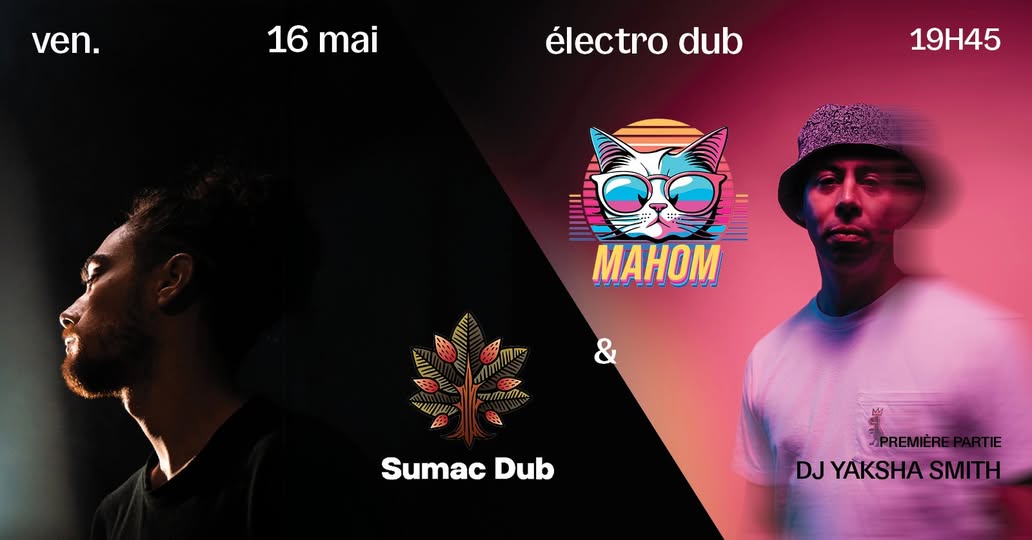 Cela fait déjà très longtemps que nous n’avions pas eu d’affiche dub à l’Espace Vasarely. On rattrape donc les 18 mois passés avec un combo de qualité : Sumac dub et Mahom ! Et pour ouvrir la soirée, Yaksha Smith endossera la cape de DJ pour chauffer la salle comme il se doit