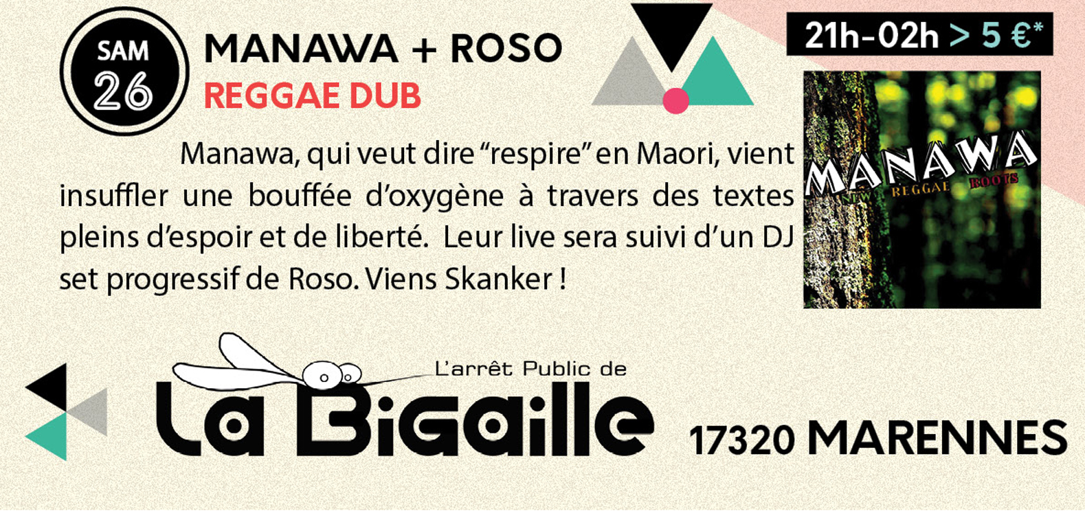Manawa, qui veut dire “respire” en Maori, vient insuffler une bouffée d’oxygène à travers des textes pleins d’espoir et de liberté. Leur live sera suivi d’un DJ set progressif de Roso. Viens Skanker !