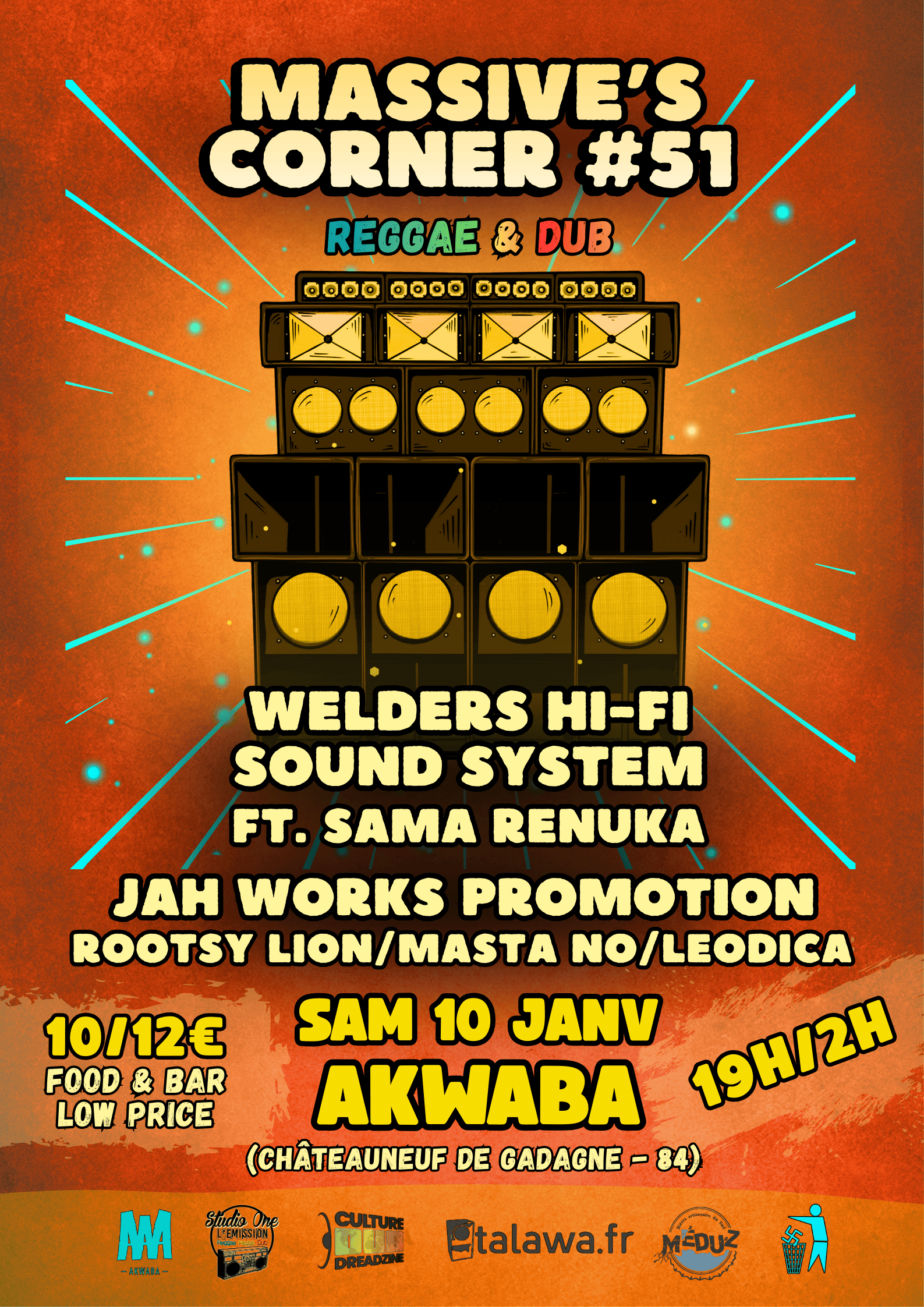 Amateurs de reggae et de basses massives depuis des années, Albah (MC, sélecteur) & Jo (opérateur, sélecteur) ont construit leur propre sono en 2009 sur Avignon. Une recherche de clarté et de puissance qui se poursuit depuis pour partager cette musique qui ne prend à leur sens tout son relief qu’avec un sound system « homemade ». Résident des soirées « Massive’s Corner » depuis plus de 10 ans et jouant régulièrement avec les plus grands en France et en Europe, Welders Hifi a fondé en 2013 son propre label « Welders Records » et multiplie depuis les collaborations avec des artistes reconnus tels que Murray Man, King General, Charlie P, Ras Mykha, Joe Pilgrim, Dusty Wata ou encore Sama Renuka la chanteuse du collectif.