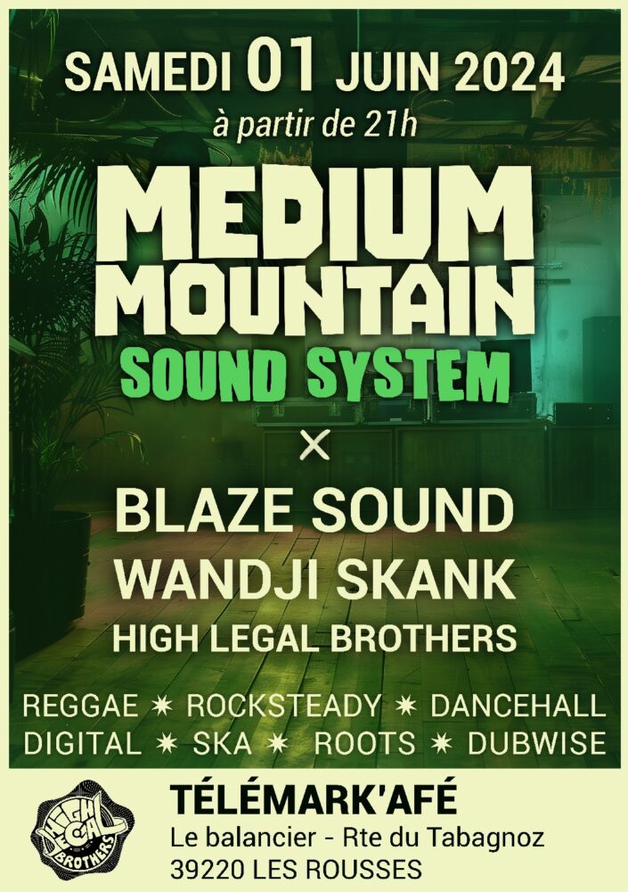 Le Telemark’afé et l’association High Legal Brothers t’invitent à venir partager un moment en musique et danser sur le Medium Mountain Sound System accompagné par Blaze Sound, Wandji Skank et les membres de High Legal Brothers.