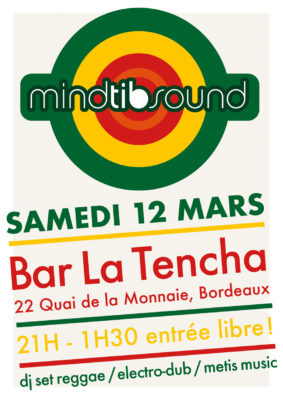 Bienvenue le samedi 12 mars à partir de 21h (jusqu’à 01h30) au bar/club LA TENCHA à Bordeaux (22 quai de la monnaie) pour un dj set reggae/dub/métis music du périgourdin MINDTIBSOUND. L’entrée est gratuite, le bar dispose d’une bonne sono et d’une grande skanking’ piste pour partager ensemble de bonnes ondes !
