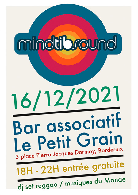Bienvenue à tous le jeudi 16 décembre 2021 entre 18h et 22h avec MINDTIBSOUND au bar associatif « le petit grain » (3 place Pierre Jacques Dormoy) en plein cœur de Bordeaux pour un DJset dédié au reggae/dub/musiques du monde. Entrée gratuite !