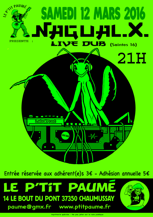 Nagual X sera en concert dub live le 12 Mars 2016 au local associatif du P’tit Paumé à Chaumussay (Indre-et-Loire 37)