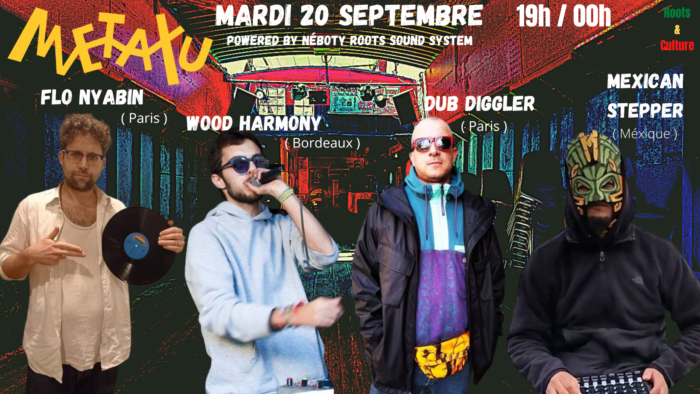Royales Salutations à toutes et à tous , Nous avons le plaisir de vous inviter Mardi 20 Septembre sur la Péniche Metaxu exceptionnellement pour la rencontre Sound system du Mardi , Néboty Roots laisse le contrôle à Nyabin / Wood Harmony / Dub Diggler / Mexican Stepper pour une session qui s’annonce pas comme les autres avec ces 4 producteurs de Dub surboosté !