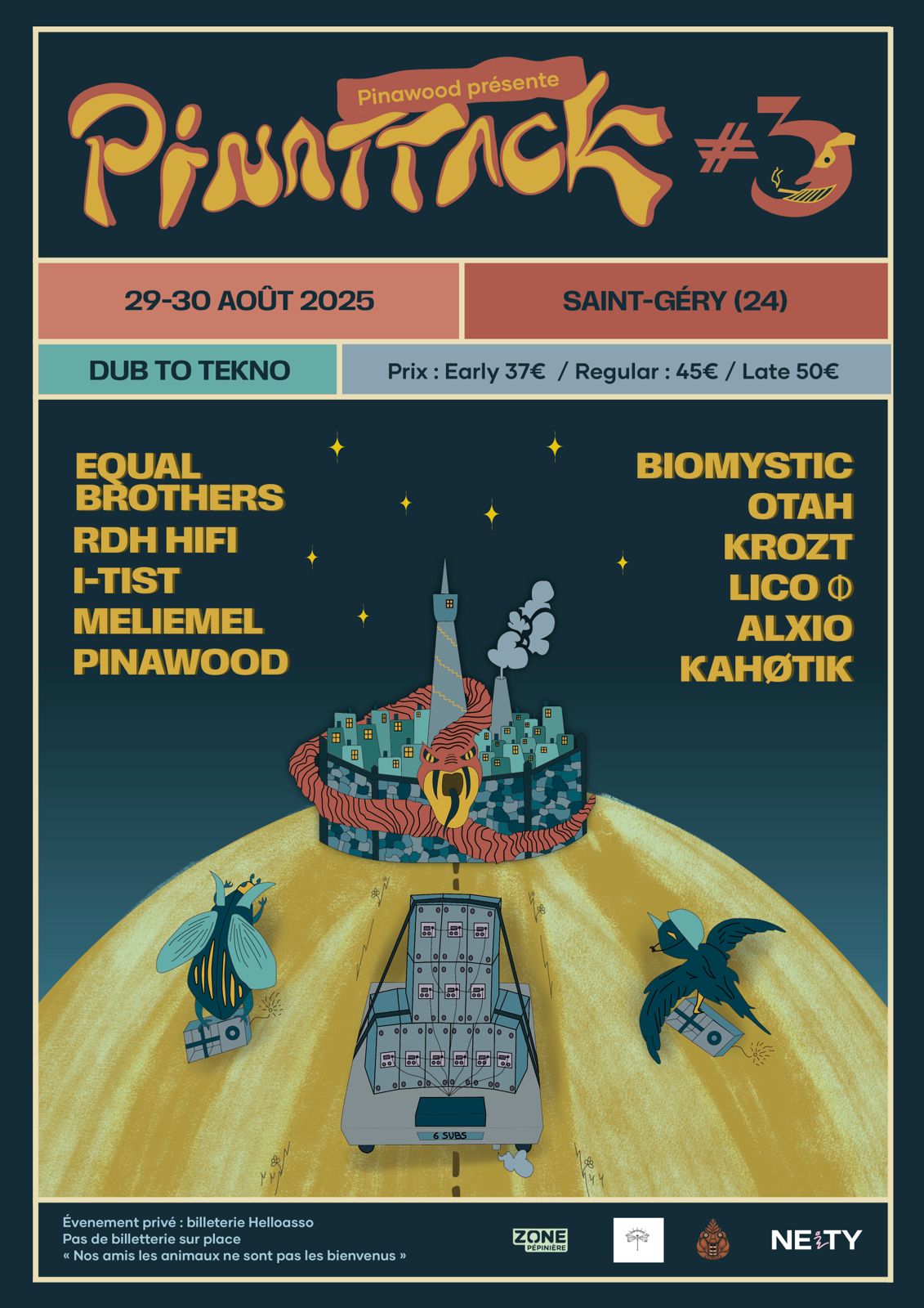 Pour rappel, Pinattack c’est un événement privé, aux allures d’un festival de 2 jours avec : une soirée 100% Dub le Vendredi, et une soirée Dub to Tekno le Samedi
