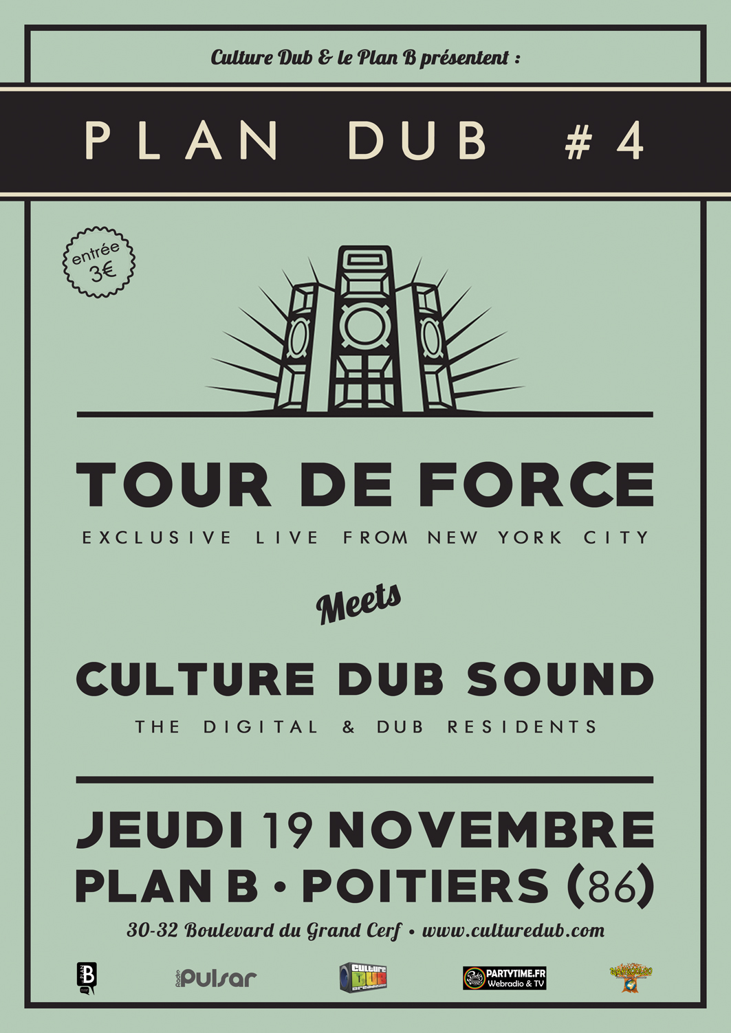 Affiche exceptionnelle pour ce Plan Dub #4 avec la venue de Tour de Force de New York ! A la tête du label Dub Stuy Records, Q-Mastah (DJ/Producteur) et Jay Spaker (Chanteur/Producteur) proposent un Dub frais et innovant, mélangeant le Reggae des origines à la Bass Music moderne. Avant de se produire au Télérama Dub Festival à Paris, Tour de Force débarque au Plan B en configuration inédite, en live band avec cuivres et batterie ! A leurs côtés, le Culture Dub Sound revient retourner le Plan B avec une sélection vinyles et dubplates du Reggae Digital au Dub Stepper. A ne manquer sous aucun prétexte !