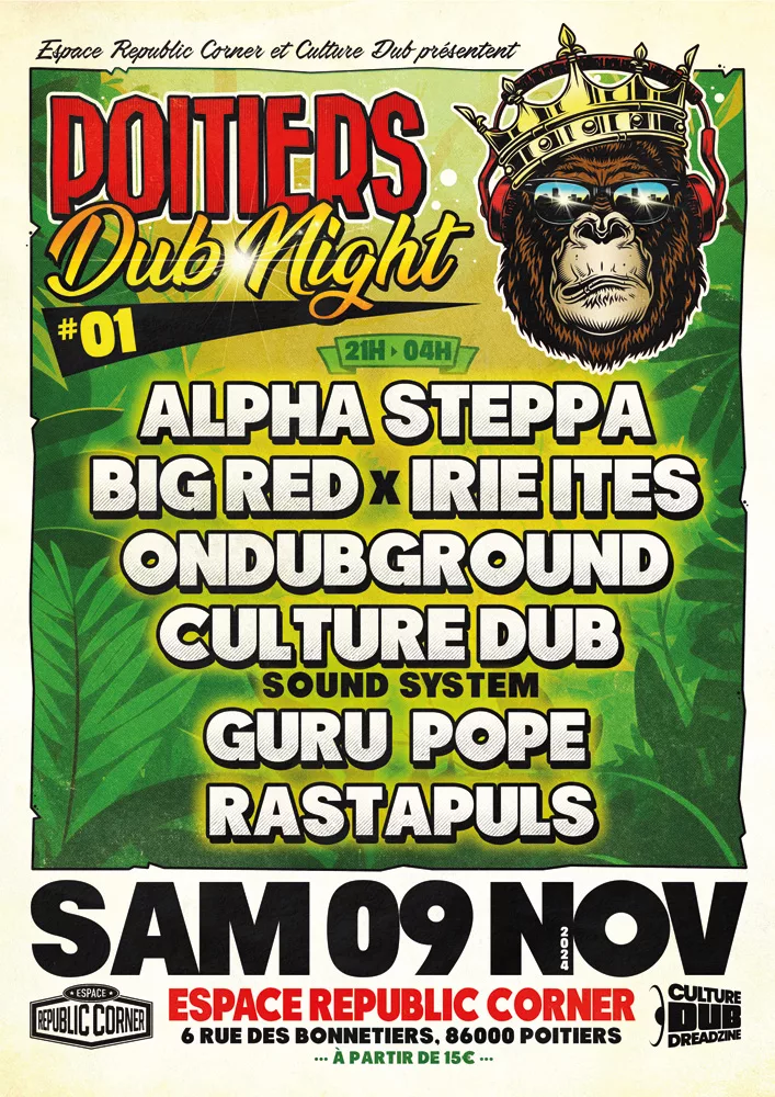 Culture Dub et l’Espace Republic Corner présentent la première édition des Poitiers Dub Night le samedi 09 Novembre 2024 à l’Espace Republic Corner de Poitiers, une édition sous le signe du Dub, aussi bien en Live qu’en Sound System, avec Alpha Steppa, Big Red, Irie Ites, Ondubground, Rastapuls, Guru Pope et le Culture Dub Sound System… Le rendez-vous pictavien de la culture Dub à ne louper sous aucun prétexte !