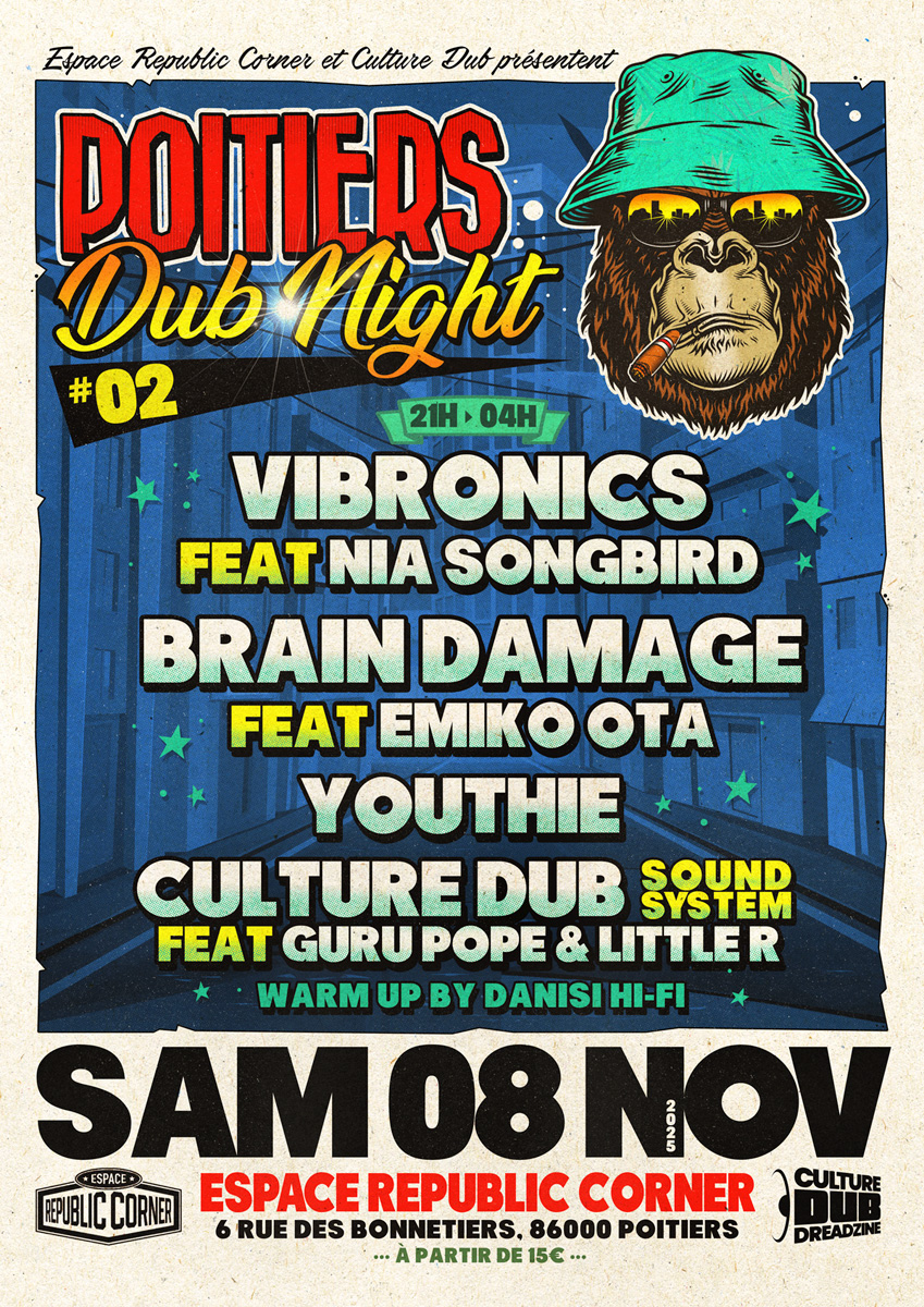 Culture Dub et l’Espace Republic Corner présentent la seconde édition des Poitiers Dub Night le samedi 08 Novembre 2025 à l’Espace Republic Corner de Poitiers, une édition sous le signe du Dub international, aussi bien en Live qu’en Sound System, avec Brain Damage ft Emiko Ota, Vibronics ft Nia Songbird, Youthie, Little R, Guru Pope, Danisi HifI et le Culture Dub Sound System… Le rendez-vous pictavien de la culture Dub à ne louper sous aucun prétexte. Une 2de édition qui s’annonce déjà exceptionnelle !