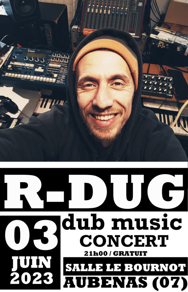 Depuis plus de 20 ans, 3 EP et 13 albums, R-DUG réunit avec ses machines le Digital Reggae et le UK Stepper, un son unique révélé au Télérama dub Festival et dont l’énergie a soufflé sur les scènes de la Meuh Folle, Zion Garden et Loupoulo. Il présentera à Aubenas son nouvel album.