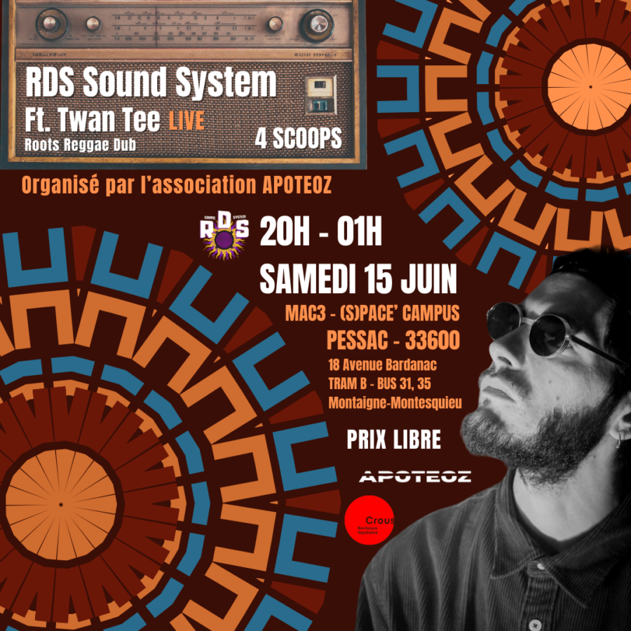 C’est avec un immense plaisir que nous annonçons notre retour après plus d’un an sans session dans la région bordelaise… Après avoir rencontré beaucoup d’artistes et d’organisateurs, nous nous associons avec Apoteoz et le Crous de Bordeaux Aquitaine pour vous proposer une big session 100% kulcha avec le mighty Twan Tee au micro qui animera la dance aux côtés du RDS Sound System en 4 scoops et, le tout, à prix libre