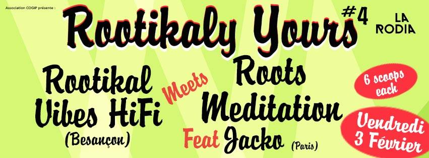 Pour cette 4ème édition des soirées Rootikaly Yours, le collectif bisontin, Rootikal Vibes HiFi, invite le sound system parisien Roots Meditation, accompagné du chanteur Jacko. Cette soirée se déroulera sous forme de meeting, chaque collectif sera présent avec son propre sound system artisanal et jouera à tour de rôle sur son matériel (6 scoops chacun).