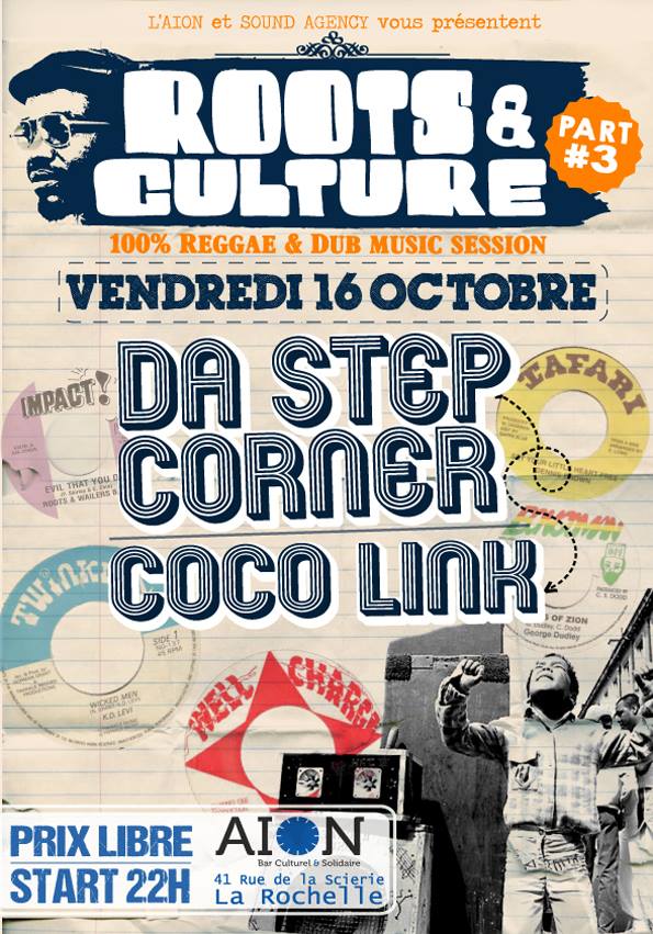 • DA STEP CORNER Sound, composé de Sham, Little Joe et Sista Lovia, revient pour une troisième édition des soirées ROOTS & CULTURE. Ils viendront vous présenter une large sélection Roots & Dub, ainsi que des productions maison et les dernières sorties du moment..