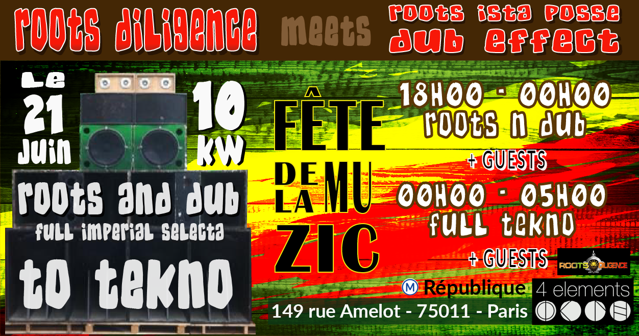 Pour l’occasion de la fête de la musique 2019 nous avons vu les choses en grand! Une odyssée Dub to Techno au 4 ELEMENTS avec comme vaisseau amiral 10KW de son made in roots diligence.