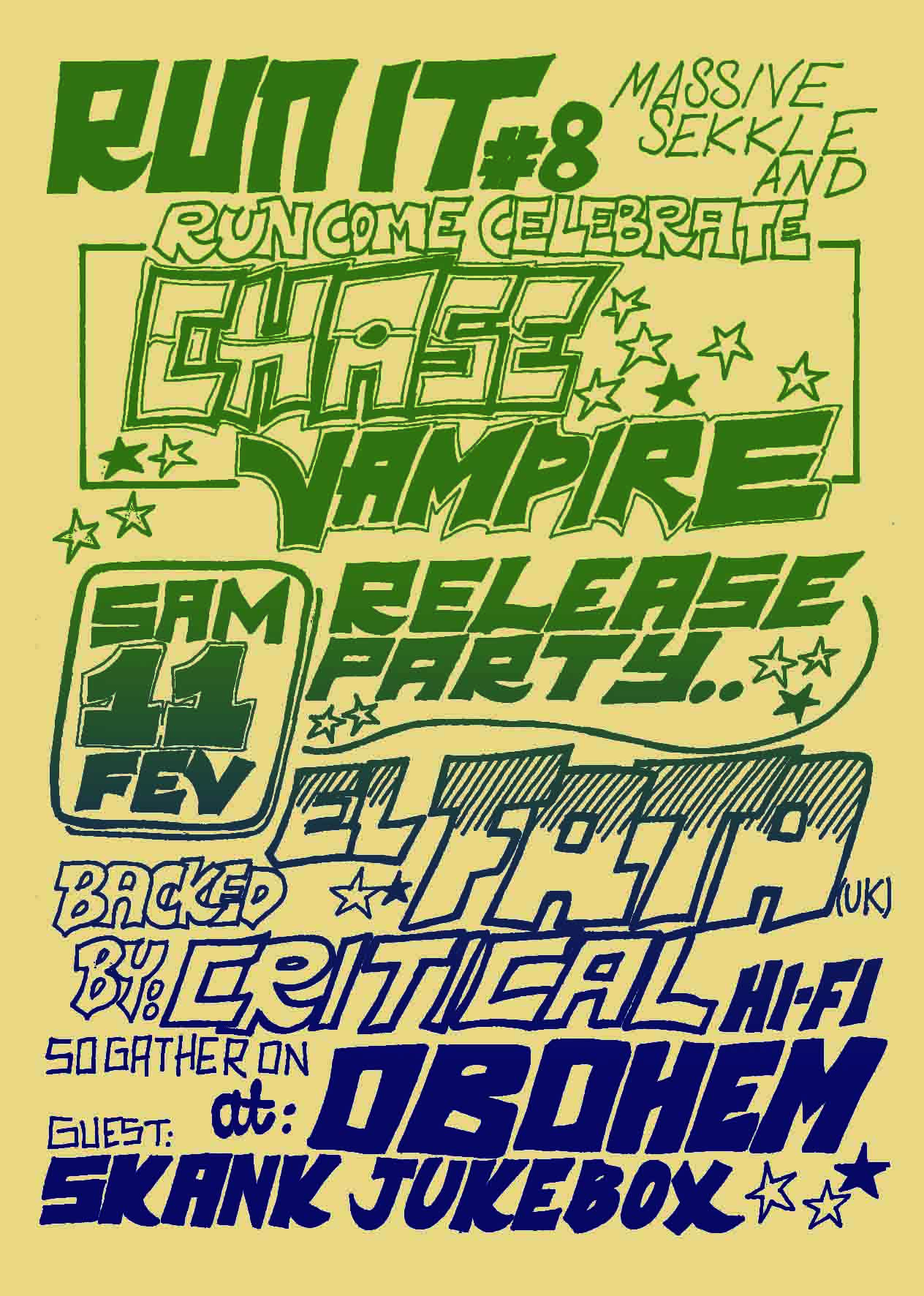 La huitième Run It ! est une édition un peu spéciale. En effet elle sera l’occasion de fêter la sortie de notre premier vinyle sur notre label CHASE VAMPIRE. Pour l’occasion nous invitons le talentueux chanteur anglais AL FATA qui viendra de Londres nous faire partager son style inimitable ! El Fata est aussi l’artiste qui chante sur notre release. Nous vous dévoilerons le morceau courant janvier. La sortie est prévue pour la mi février !