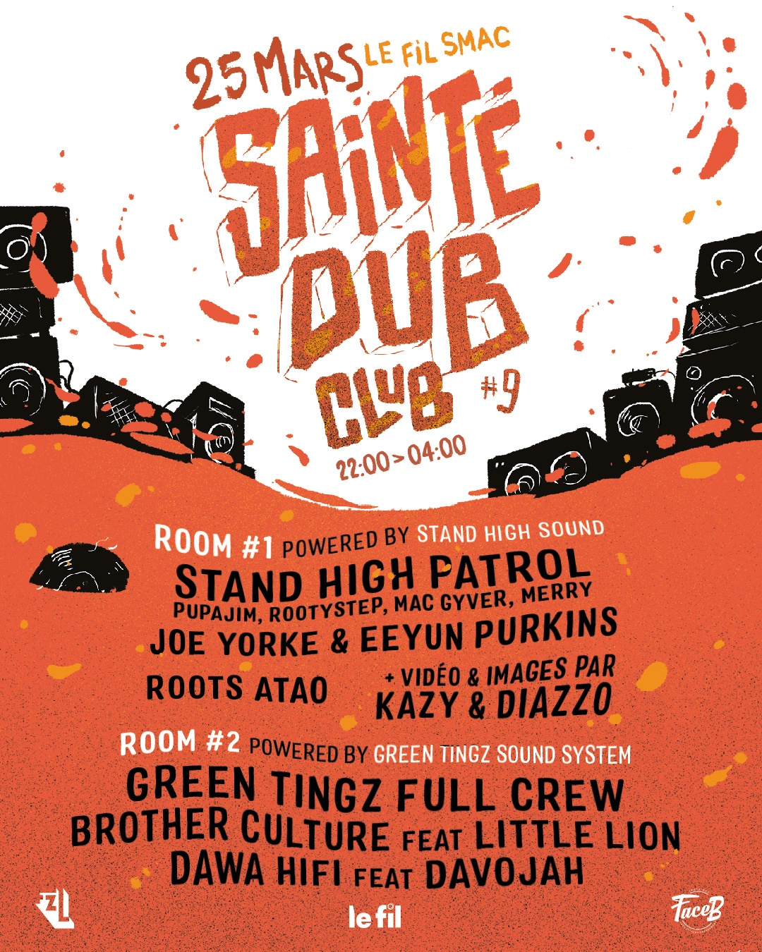 Rendez-vous le vendredi 25 mars dans les 2 salles du Fil, murs d’enceintes au sol avec Stand High Patrol, Pupajim, Joe Yorke, Roots Atao, Green Tingz sound, Brother culture, Little Lion, Dawa Hifi, Davojah & more !