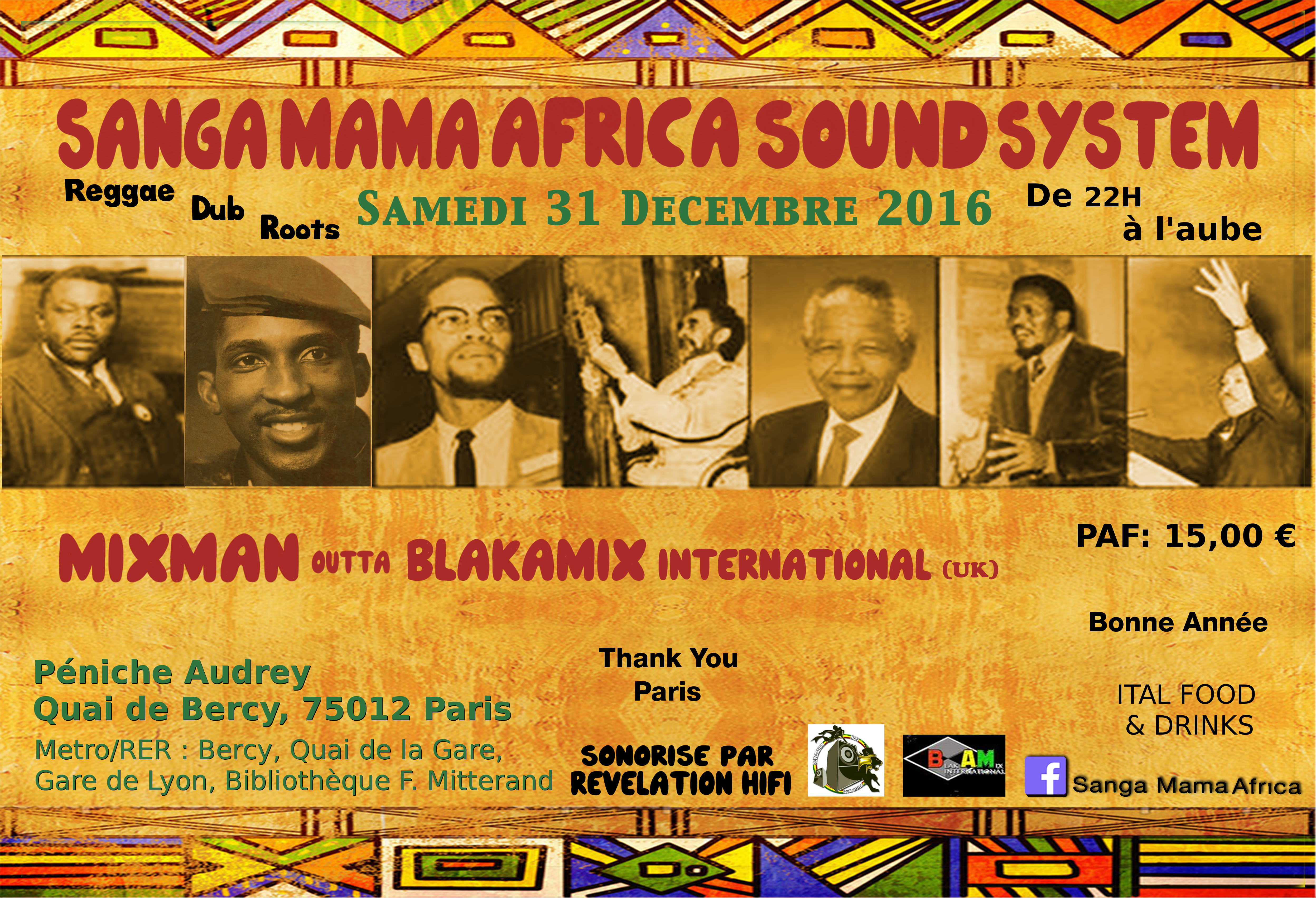 Pour finir l année en beauté la famille Sanga Mama Africa vous invite à la Dubtherapy du Samedi 31 decembre 2016 à bord de la péniche Audrey qui se situera au Quai de Bercy afin de s’enjailler pour bien débuter cette nouvelle année 2017