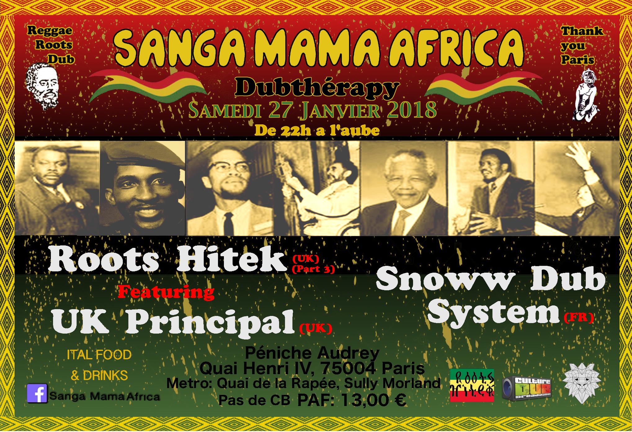 Pour cette nouvelle année 2018, Sanga Mama Africa & SDS Snoww Dub System vous invite à venir vous enjailler à la Dubthérapy du samedi 27 Janvier 2017 à la péniche Audrey situé au