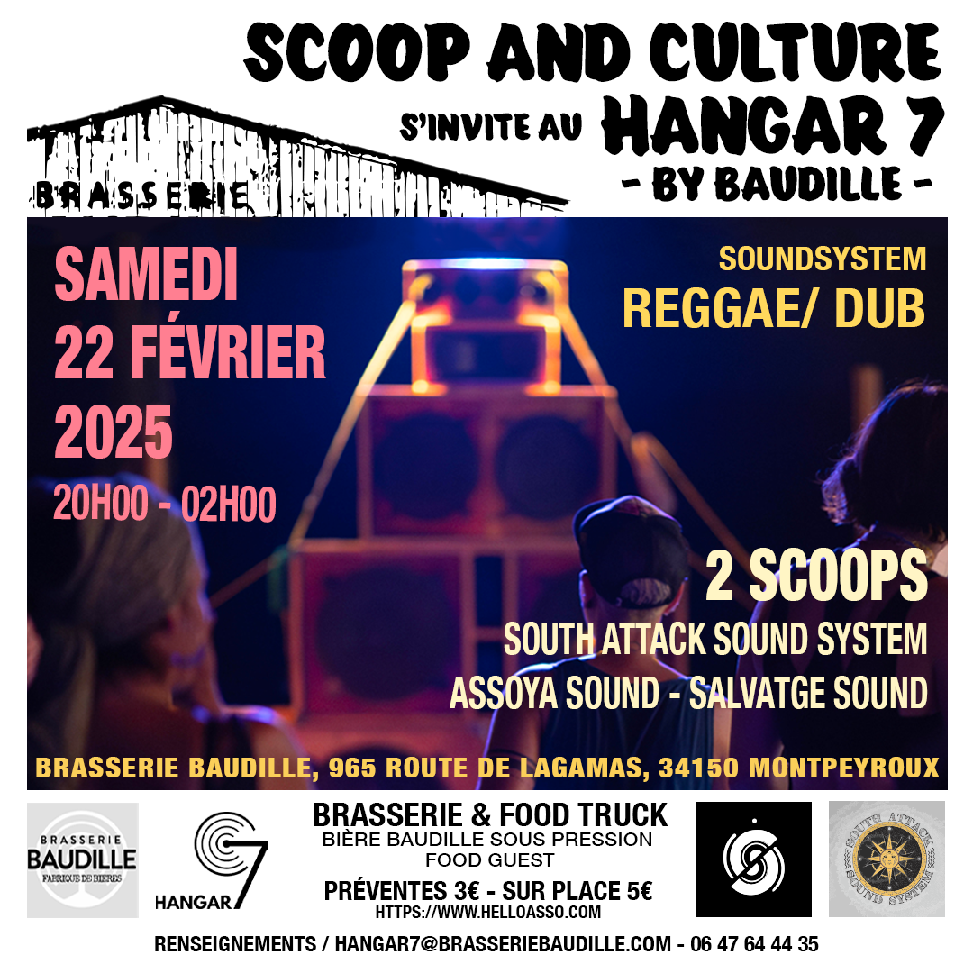 Scoop and Culture, en collaboration avec le Hangar 7, vous présente une soirée soundsystem Reggae Dub qui aura lieu le samedi 22 février de 20h00 à 02h00, à la Brasserie Baudille de Montpeyroux (34150).