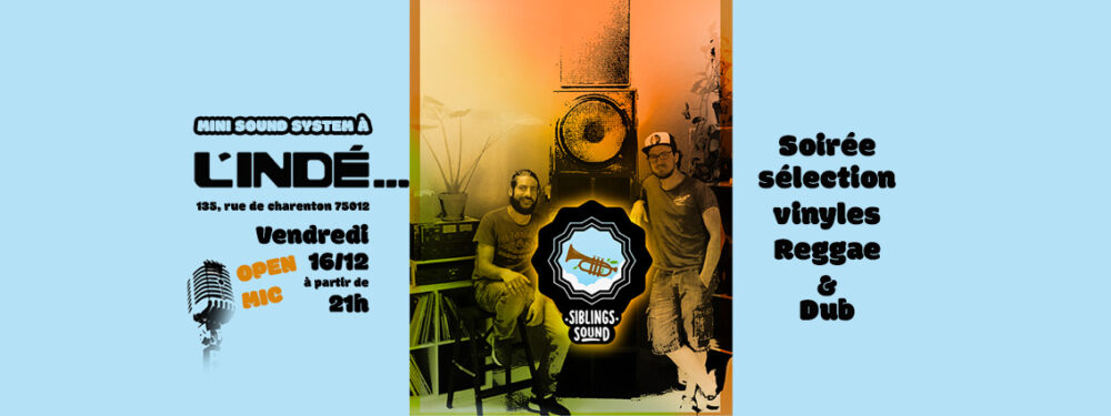 local_playSound System date_rangeLe access_timeDébut à 20 h 00 min placeÀ L'Indé, 135 rue de Charenton,