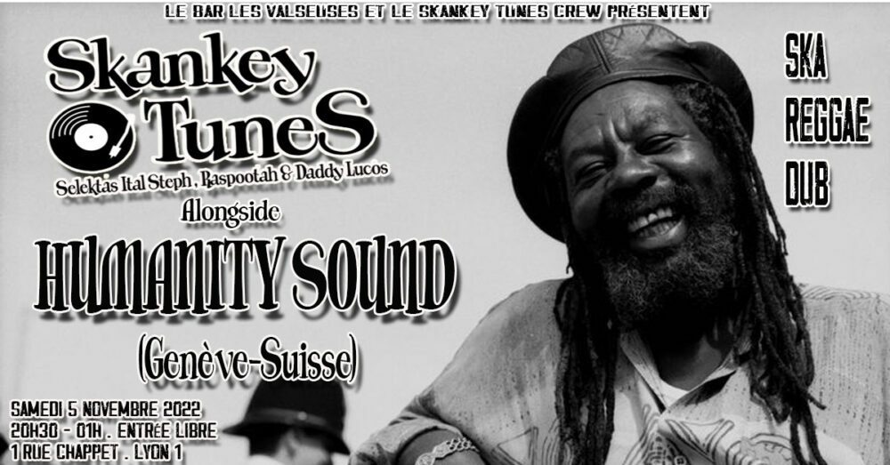 Chaque premier Samedi de mois depuis plus de dix ans, au Bar Les Valseuses c’est Reggae Stylee, du Oldies, du 80s, du Roots et du Dub. Ce mois-ci, le Skankey Tunes Crew invite les potos de Genève : Le Humanity Sound. c’est l’histoire de 3 potes unis autour de la culture Sound System et du reggae. Tout commence en 2009, année où le groupe voit le jour. Au début, Humanity Sound system est une bande de 6 potes autour d’une table de mixage voyageant du roots au new roots en passant par le hip hop et le dub .