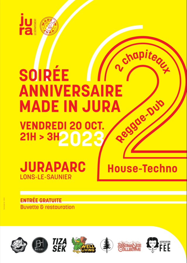 Pour l’anniversaire des 20 ans de Made In Jura, deux chapiteaux vous accueillent à l’extérieur de Juraparc, le vendredi 20 Octobre 2023.