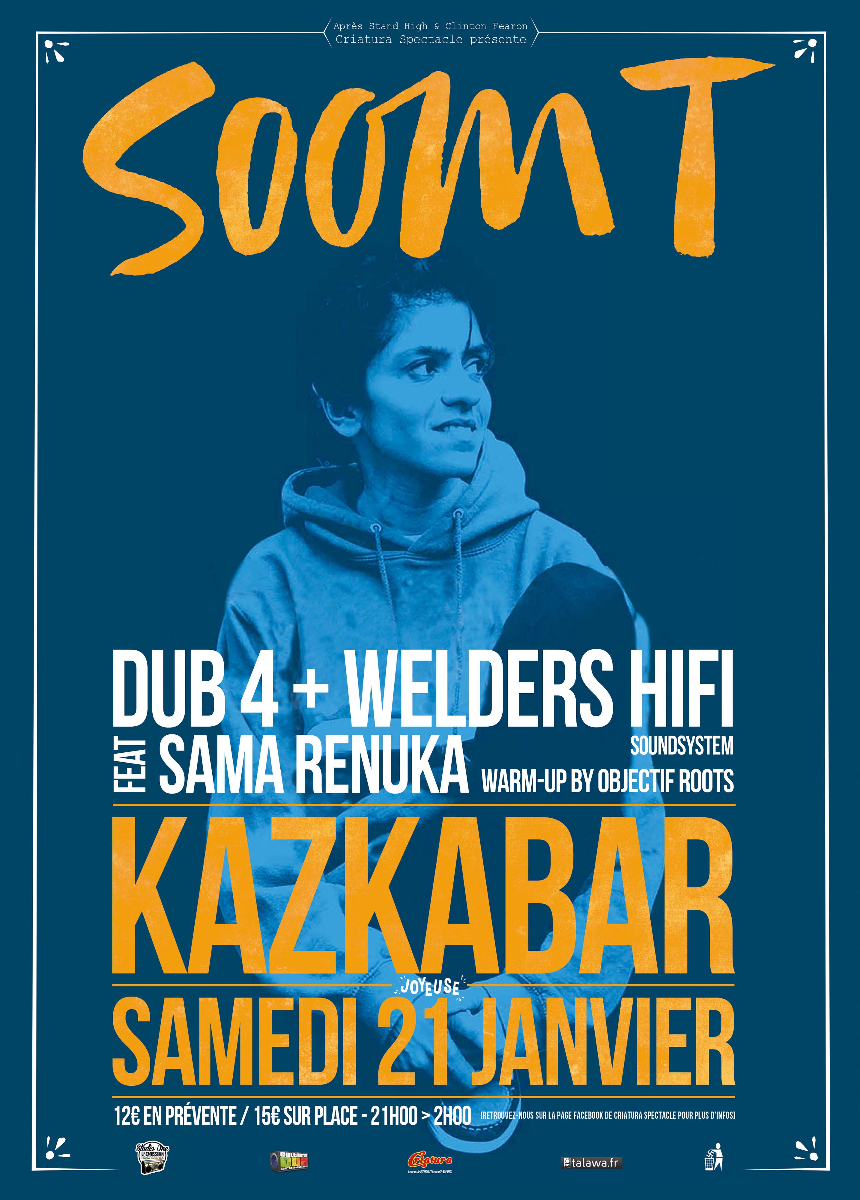 Après Clinton Fearon et Stand High Patrol, l’association Criatura Spectacles est heureuse de revenir au Kazkabar, avec une session soundsystem qui ravira tous les amateurs de reggae. En effet, Joyeuse accueillera Soom T & Dub 4, sur la sono des Welders Hi Fi, accompagnés de Sama Renuka, et avec un warm-up d’Objectif Roots.
