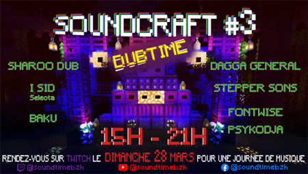 Soundtime est fier de vous présenter SOUNDCRAFT qui revient pour une 3ème édition en direct sur Minecraft et rediffusé en live sur Twitch. Rdv à 15h le dimanche 28 mars 2021.
