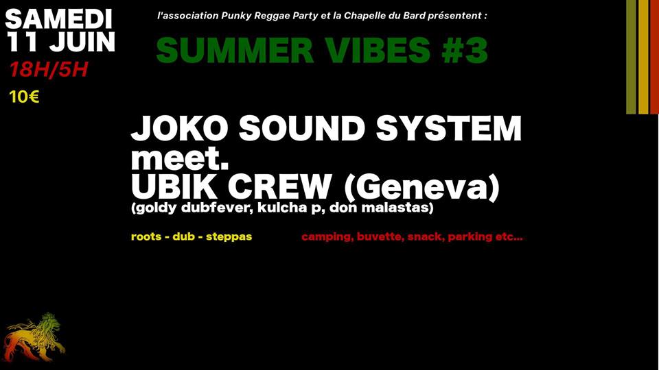 Le 11 juin à Prérond sur le spot de l’Alpin Dub, l’asso Punky Reggae Party remet le couvert avec la troisième édition du SUMMER VIBES, après une première sous la pluie full vibes en 2014, une seconde bien ruff avec TREUZ BASS l’année dernière, la troisième s’annonce mighty avec comme invité le crew montant de la obf family from geneva : UBIK.